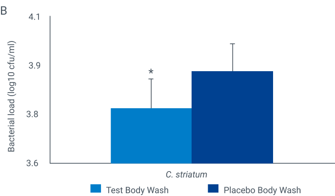 El lavado con la tecnología prebiótica demostró una inhibición en el crecimiento de C. striatum (b), mientras que conservó los niveles de S. epidermidis (a).